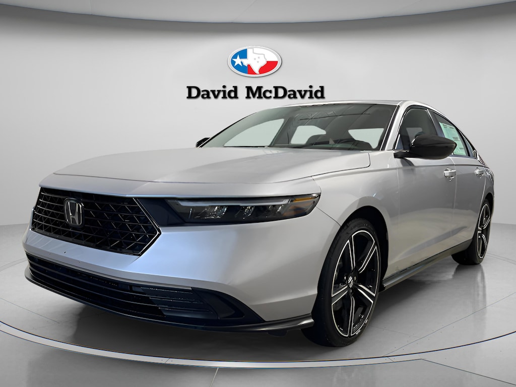 Recent Arrival! This 2026 Honda Accord Hybrid Sport IN-TRANSIT in Solar Silver Metallic comes with the following features: 4-Wheel Disc Brakes, 8 Speakers, ABS brakes, Adaptive Cruise Control: Adaptive Cruise Control (ACC) with Low-Speed Follow, Air Conditioning, Alloy wheels, AM/FM radio, Apple CarPlay/Android Auto, Auto High-beam Headlights, Automatic temperature control, Blind Spot Information (BSI) System warning, Brake assist, Bumpers: body-color, Compass, Delay-off headlights, Driver door bin, Driver vanity mirror, Dual front impact airbags, Dual front side impact airbags, Electronic Stability Control, Emergency communication system: HondaLink, Exterior Parking Camera Rear, Fabric Seat Trim, Four wheel independent suspension, Front anti-roll bar, Front Bucket Seats, Front Center Armrest, Front dual zone A/C, Front reading lights, Fully automatic headlights, Heated Front Bucket Seats, Heated front seats, Illuminated entry, Knee airbag, Lane departure: Lane Keeping Assist System (LKAS) active, Leather Shift Knob, Leather steering wheel, Low tire pressure warning, Occupant sensing airbag, Outside temperature display, Overhead airbag, Overhead console, Panic alarm, Passenger door bin, Passenger vanity mirror, Power door mirrors, Power driver seat, Power moonroof, Power steering, Power windows, Radio data system, Radio: 180-Watt Audio System, Rear anti-roll bar, Rear reading lights, Rear seat center armrest, Rear side impact airbag, Rear window defroster, Remote keyless entry, Security system, Speed control, Speed-sensing steering, Speed-Sensitive Wipers, Split folding rear seat, Spoiler, Steering wheel mounted audio controls, Telescoping steering wheel, Tilt steering wheel, Traction control, Trip computer, Variably intermittent wipers, and Wheels: 19 x 8.5J Berlina Black.